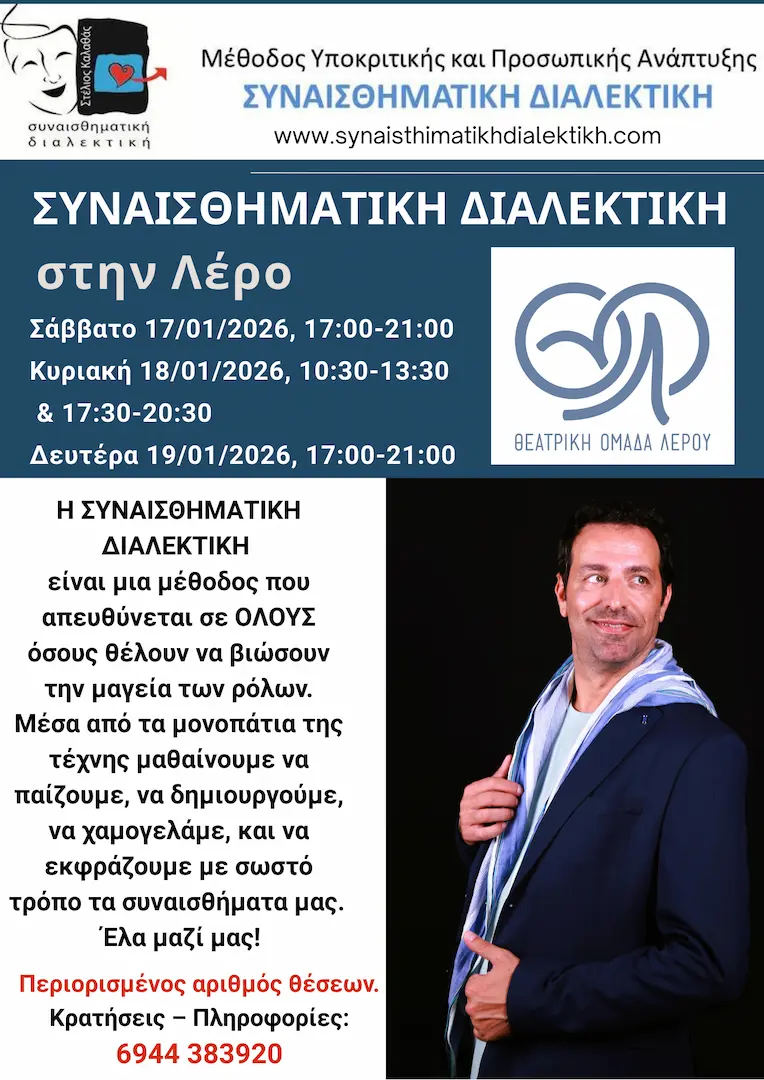 Theather at Agia Marina LerosThe Leros Theatre Group is organizing an experiential seminar titled “Emotional Dialectics”, led by Stelios Kalathas.A pioneering, theatre-based method that focuses on emotion, authentic communication, and free self-expression through speech, […]